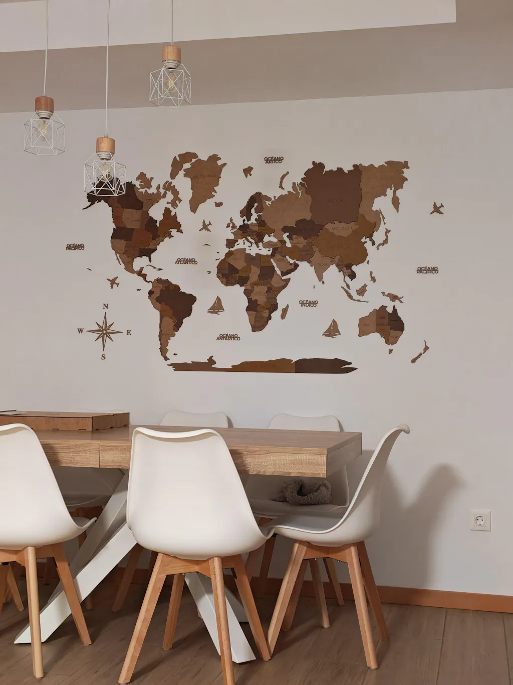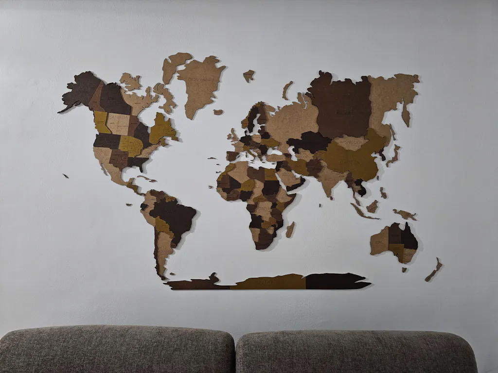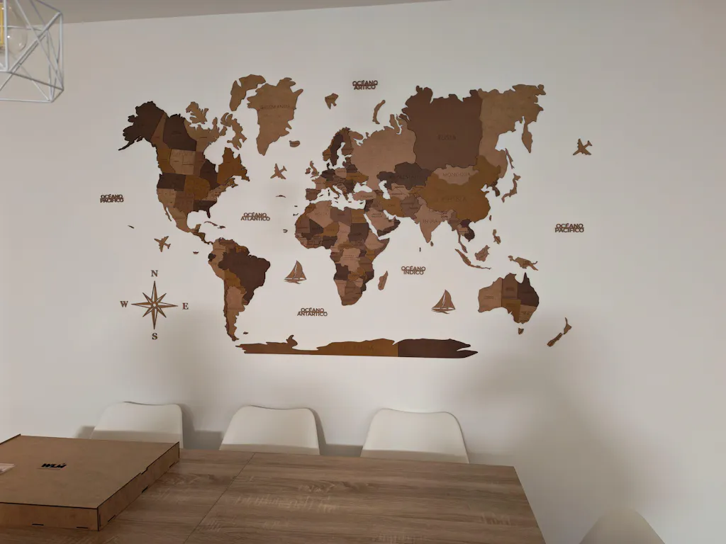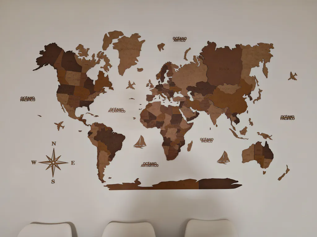 Mapamundi 3D de madera en 4 colores para decoración de paredes.